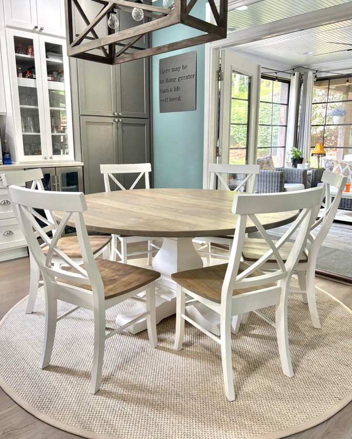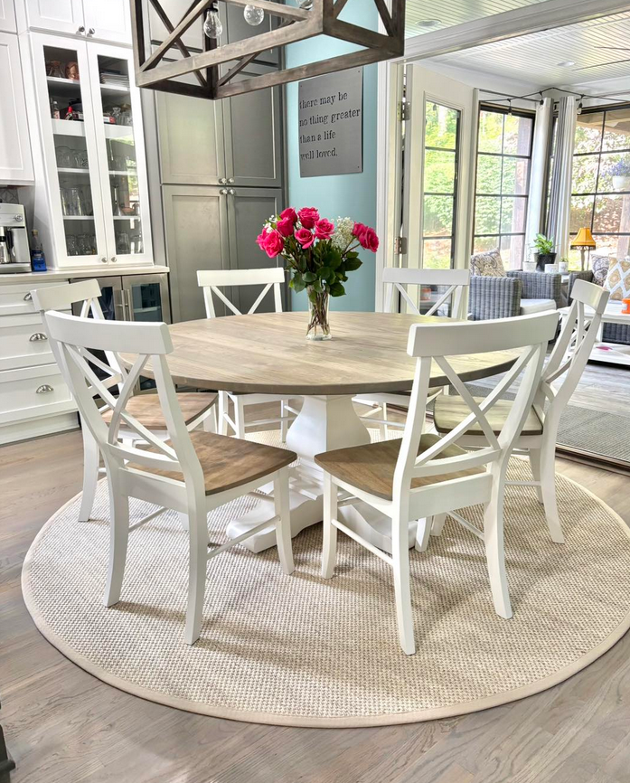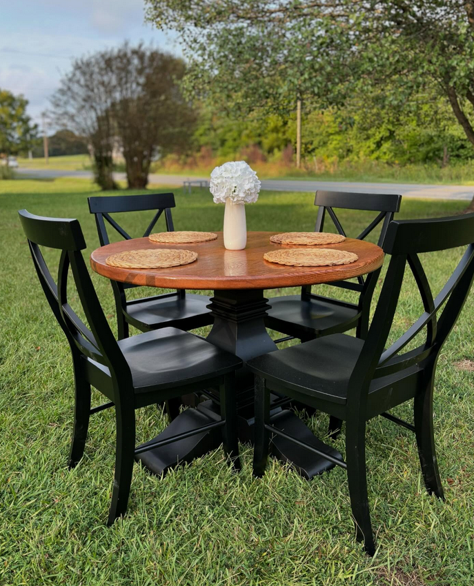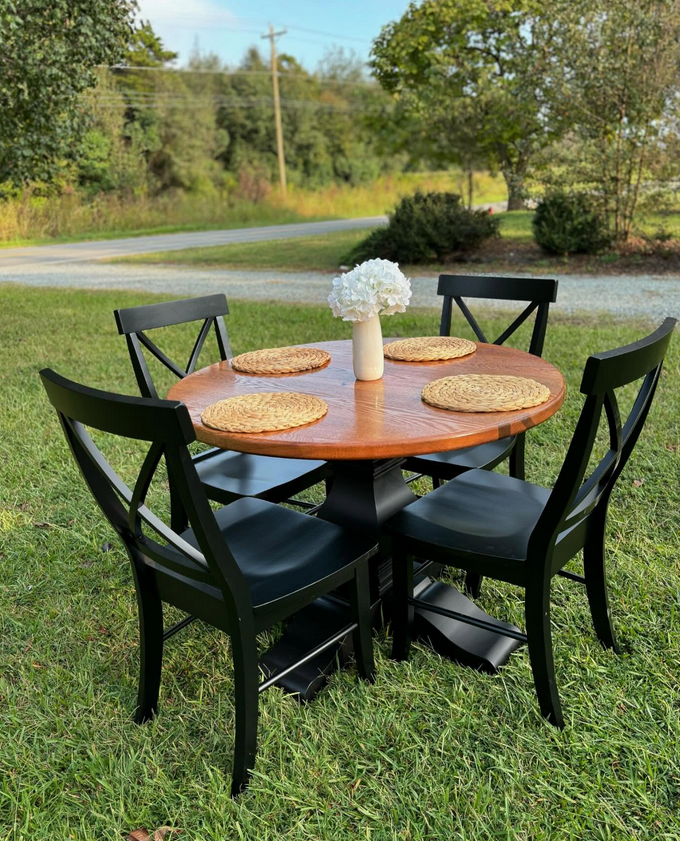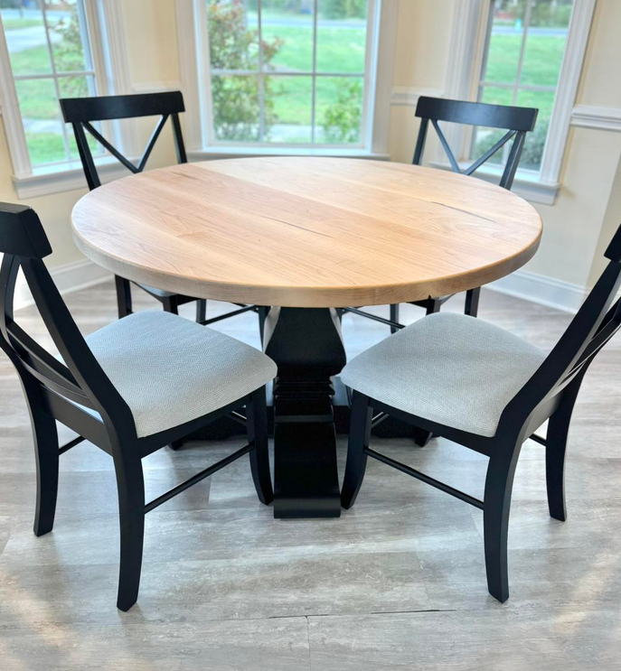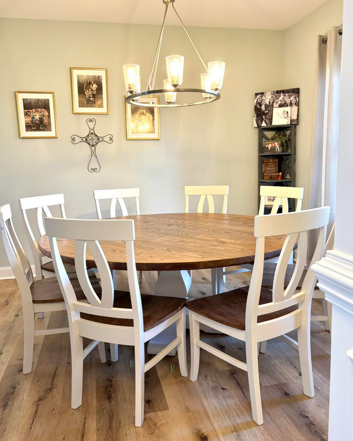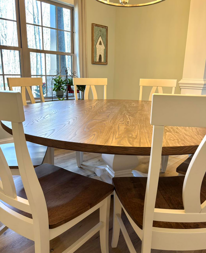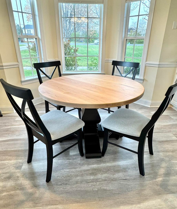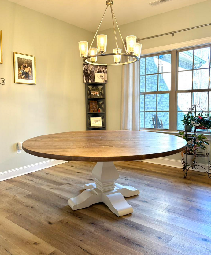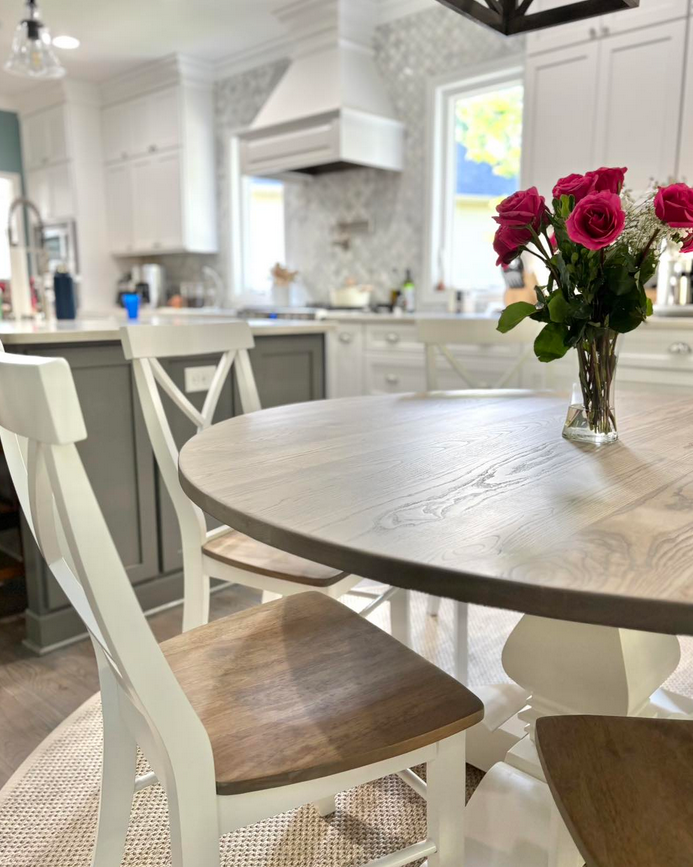 Meet the Cabarrus, named for Cabarrus County, NC. By far our best selling round table style! The Cabarrus is a fan favorite that never disappoints. We've delivered this to homes made in the 1920s and homes made in 2025! It just fits! Made by hand right here in Wingate, each dining table is crafted from solid hardwood and finished with care for everyday use and lasting beauty. Custom sizes, stains, and finishes available.
